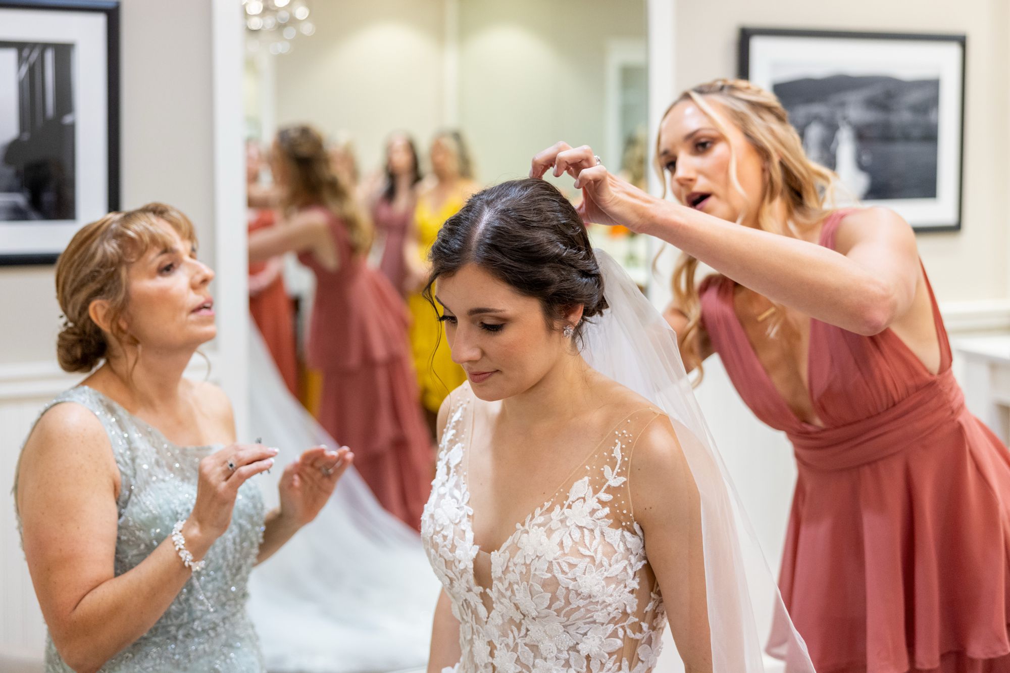 Plan for your bridesmaids and mom/aunt/grandmother to get dressed before you. They will want to be photo ready as they help you into your dress. Set aside 30 minutes of time for you to get into your own dress. Now you may think, why so long? This is where we build in buffer room in case things are running late, or your dress is being a diva and requires a little extra time to get perfect! Plus you’ll want time to take it all in, and enjoy this moment with everyone surrounding you.